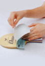 クリーナーで汚れなどを取り除いたあと、ラバー表面に粘着保護フィルムを貼り、汚れやほこりからラバー表面を守ります。フィルムをラケットの大きさに合わせて切って使うとはがれの心配がありません。 |
